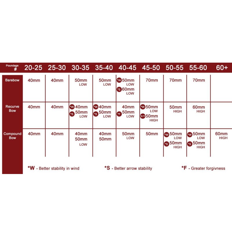W celu wybrania odpowiedniego rozmiaru i profilu lotek zachęcamy do sprawdzenia tabel sporządzonych przez producenta pokazanych na zdjęciach 2 oraz 3.