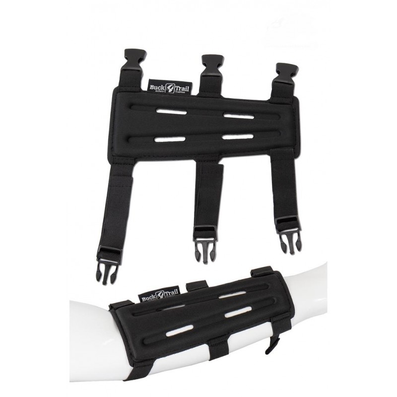 Ochraniacz mocowany jest do ręki za pomocą trzech elastycznych pasków zapinanych na plastikowe pętelki. Taki system zapięcia gwarantuje, że ochraniacz nie będzie się przesuwał ani obracał w trakcie strzelania, zapewniając stabilną ochronę. Jego symetryczny kształt sprawia, że jest to produkt w pełni uniwersalny – pasuje zarówno na prawą, jak i lewą rękę.