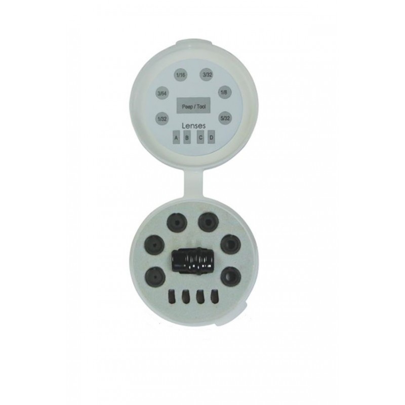 Zestaw zawiera: Baza InSight Peep, 6 przysłon (1/32″, 3/64″, 1/16″, 3/32″, 1/8″, 5/32″), 4 soczewki typu clarifying(A, B, C, D), narzędzie do montażu przysłon oraz etui ochronne.