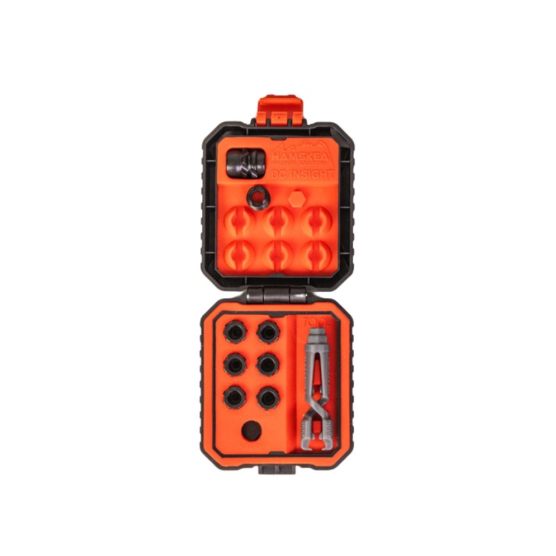 Zestaw zawiera sześć wkładów o średnicy od 1/32" do 5/32", zapasowy kartridż Light Baffle, specjalne narzędzie do montażu bezdotykowego oraz solidne etui transportowe.