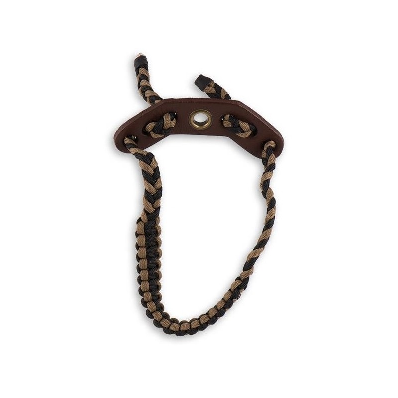 Wykonana z plecionego wytrzymałego nylonowego sznurka smycz do łuku bloczkowego zaopatrzona w skórzany pasek z metalową przelotką.